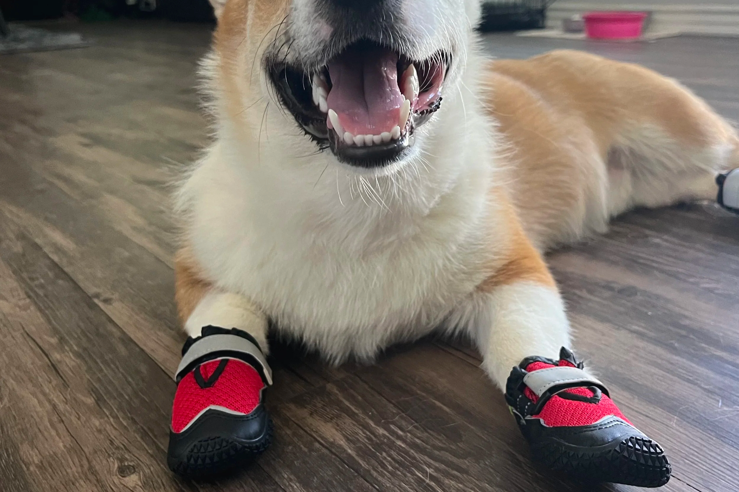 Touch the pavement with the back of your hand — if it’s too hot for you, it’s too hot for your dog. Stick to grass or use paw protection boots (shown left).